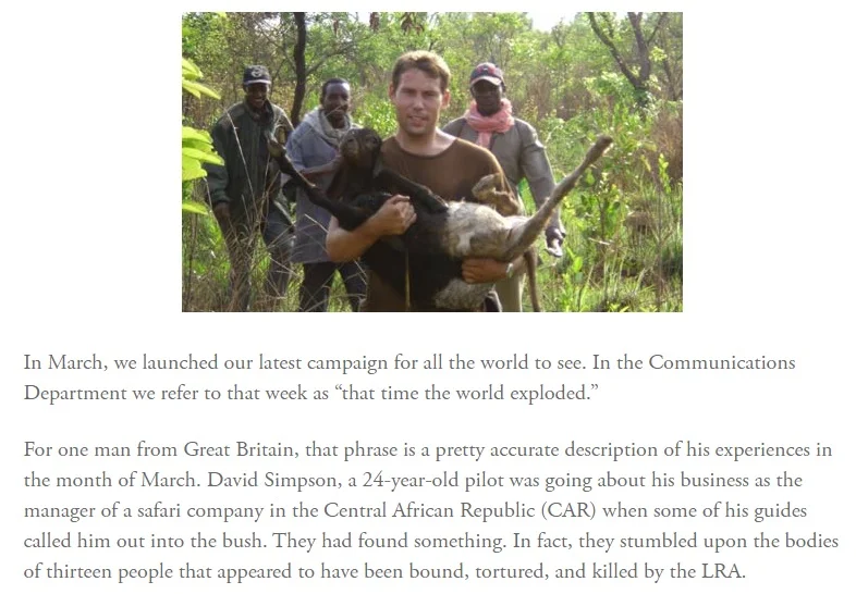 During my time at Invisible Children, I spent a couple of months traveling across the Rocky Mountains sharing about our #KONY2012 campaign. When I returned to the office, I was given the opportunity to work in the communications department. I worked closely with the staff writers and communication director for several months, writing blogs, helping with social media and email campaigns, and developing a content messaging strategy.
